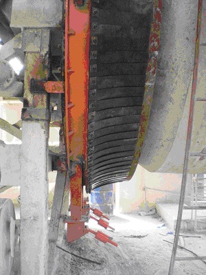 e)這種密封形式可以適應(yīng)回轉(zhuǎn)窯筒體徑向跳動(dòng)、軸向串動(dòng)等問題,在筒體變形、偏擺和串動(dòng)的情況下,仍然能夠保證良好的密封,有利于改善窯漏風(fēng),熱工制度很難穩(wěn)定、熟料升重低、結(jié)圈現(xiàn)象,臺(tái)時(shí)產(chǎn)量、熟料質(zhì)量偏低等問題。