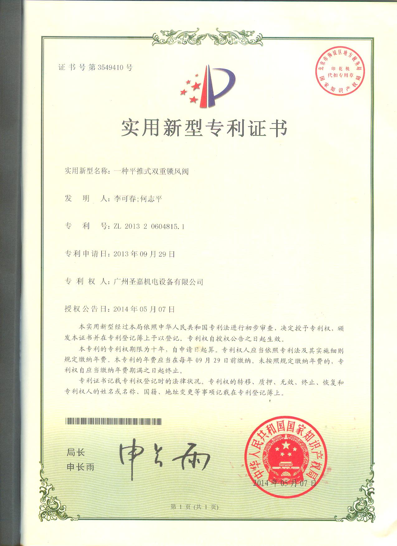 雙重鎖風(fēng)閥專利證書
